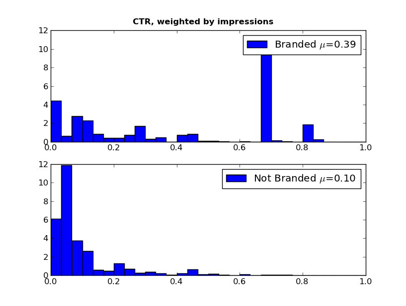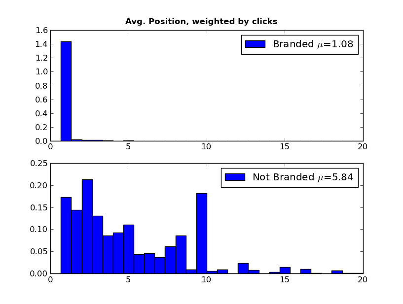 We see a huge difference in Average Position and CTR between the branded and non-branded words. Most of our traffic from branded words is in the top two or three positions, with non-branded queries sending traffic throughout the top 10. The CTR is also significantly different with a few branded keywords having very high CTR (60%+).
