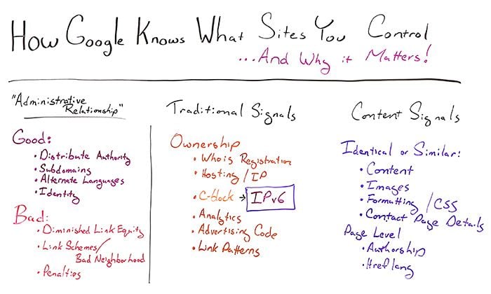 But Google, over the past decade or so, has spent an incredible amount of energy trying to figure out administrative relationships between websites, both to help you and sometimes to discount links between those sites or potentially some negative consequences. The reason that this is so important to Google is because, if you think about the link graph and relationships between sites, links between sites that are controlled by the same person probably shouldn't count as much as links that are editorial and controlled by other people, because when you get links, you want them to be natural and not something that you control.
