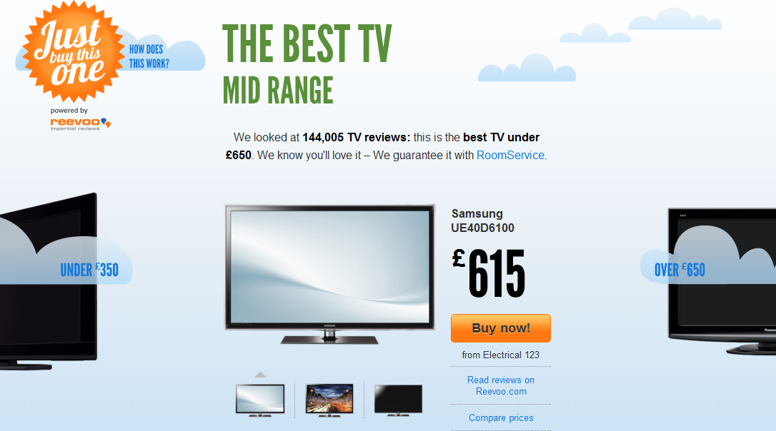 The second option I see for scaleable content comes in the form of machines. While there are many formats this could take, one angle I particularly like is inspired by Just Buy This One (disclaimer: Reevoo are a Distilled client). The premise here is to use big data to make your decision process incredibly easy. The buying cycle here is for electronics: