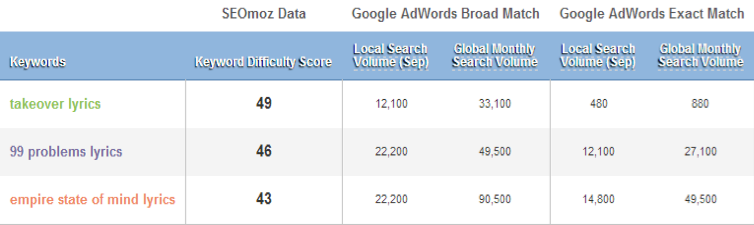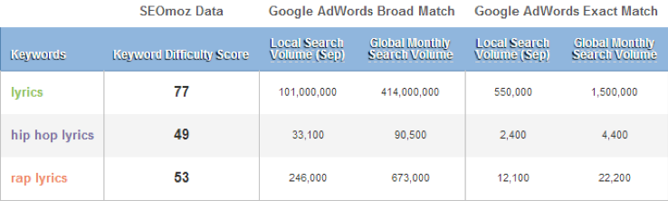 Keep in mind that only takes into account “lyrics” keywords that point to lyrics pages.