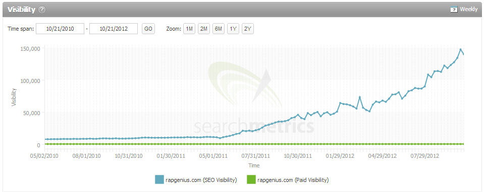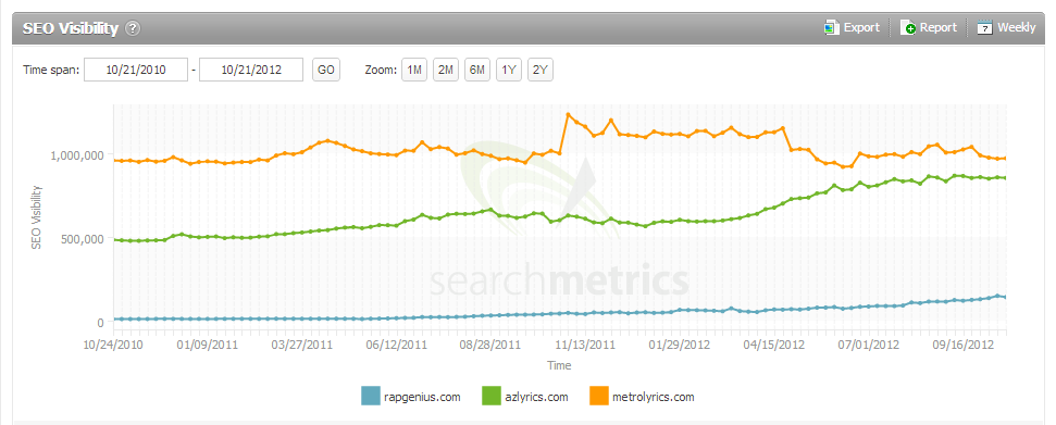This chart isn’t entirely fair since both metrolyrics.com and azlyrics.com have been around much longer and have lyrics for all genres, not just rap. Still, both of those sites hold the top two positions for many keywords Rap Genius is targeting.