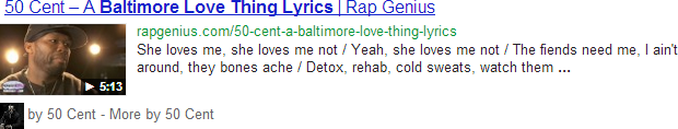 Rap Genius should also start leveraging their ‘Verified Artists’ and a combination of Schema.org markup to get Artist Authorship next to their SERP listings. *See the hypothetical snippet above.
