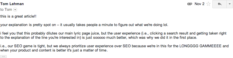 This method of placing explanations on their own unique page and then gracefully redirecting users to the specific line on the main ‘Lyrics’ page was in fact set up for ease of development and with user experience as their first priority. I asked Tom Lehman, Rap Genius co-founder while researching for this post: