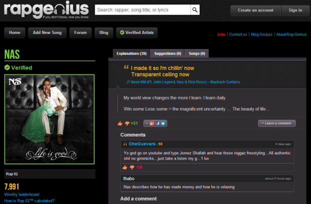 Verified Artists are users who are themselves known rappers and who’ve teamed up with Rap Genius to annotate their own songs. Check out Nas’ profile page: