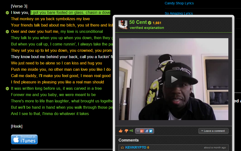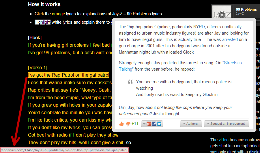 - Lyrics which are orange can be clicked to display a popup with annotations and explanations submitted by users. (Users can also upvote/downvote explanations.)