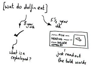 I've got this "What do dolphins eat?" because this was the first question that the researchers gave to the kids to say sit down in front of a search box, go. They tell this little anecdote, a little bit kind of soul-destroying, of this I think it was a seven-year-old child who starts typing dolphin, D-O-L-F, and then presses Enter, and it was like sadly there's no dolphins, which hopefully they found him some dolphins. But a lot of the kids succeeded at this task.
