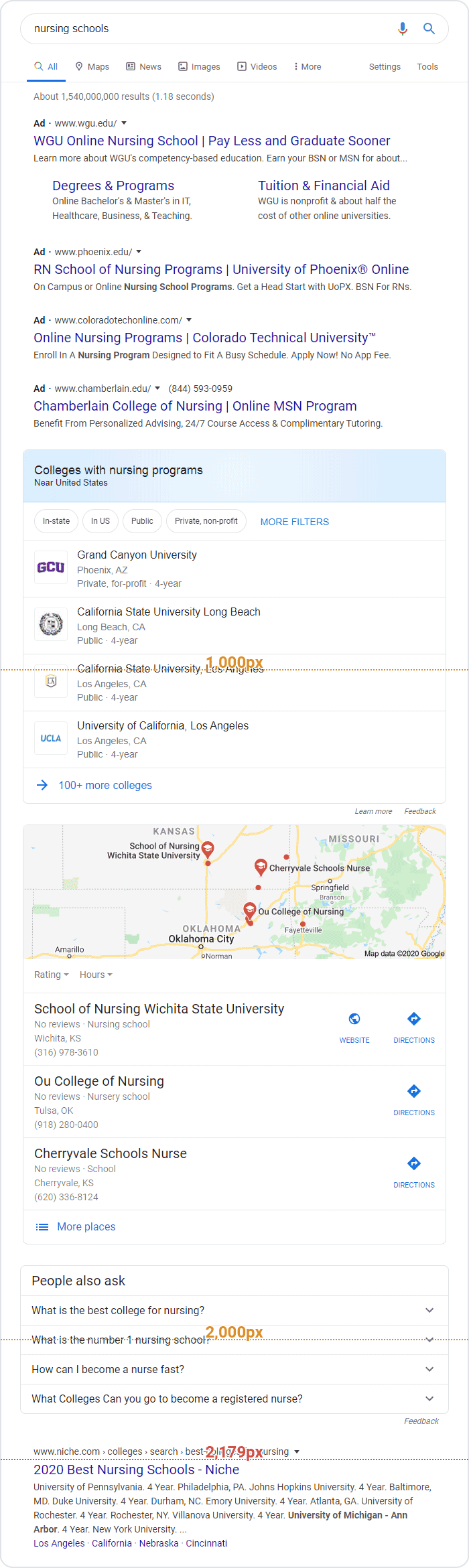The college results are a fairly rare feature, and local packs often appear on commercial results (as anyone who wants to buy something is looking for a place to buy it). Even with four ads, though, this result comes in significantly higher than our overall worst-case #1 position. While ads certainly push down organic results, they also tend to preclude other rich SERP features.