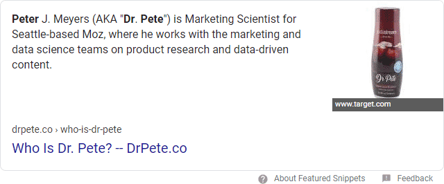 In early 2014, a year after our original study, Google launched featured snippets, promoted results that combine organic links with answers extracted from featured pages. For example, Google can tell you that I am both a human who works for Moz and a Dr. Pepper knock-off available at Target ...