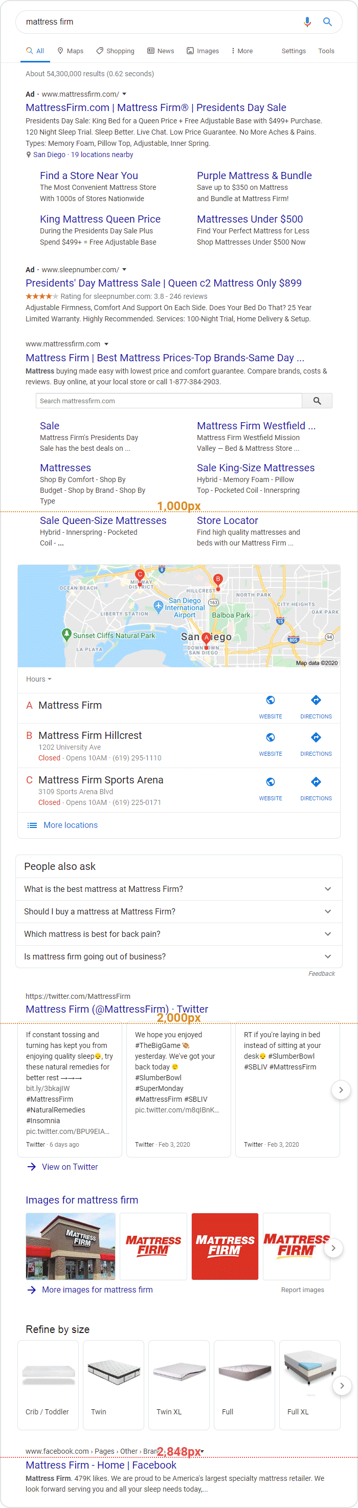While the #1 result has solid placement, the #2 result is pushed all the way down to 2,848px. Note that the #1 position has a search box plus six full site-links below it, taking up a massive amount of real estate. Even the brand's ad has site-links. Below #1 is a local pack, People Also Ask results, Twitter results from the brand's account, heavily branded image results, and then a product refinement carousel (which leads to more Google searches).