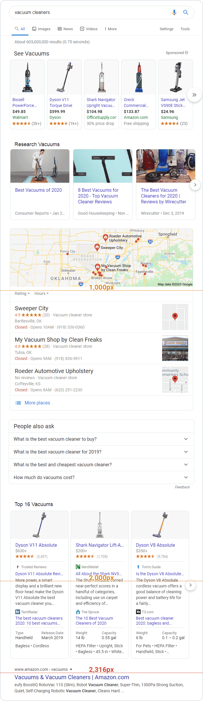 Before the traditional #1 organic position, we have shopping results, a research carousel, a local pack, People Also Ask results, and a top products carousel with a massive vertical footprint. This is a relentlessly commercial result. While only a portion of it is direct advertising, most of the focus of the page above the organic results is on people looking to buy a vacuum.