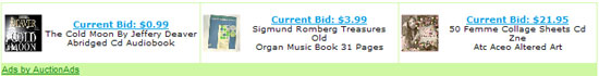Basically, you sign up on their site to be an AuctionAds publisher and insert their ad code on your site. They show relevant eBay products to your visitors (relevant meaning related to your site's content), and you make money when a visitor clicks on the ad. I chatted with Neil Patel about AuctionAds because he's pretty familiar with the site, and he said that AuctionAds places a 30-day cookie on users who click through from your site, so during that time if they convert into a signup or win an auction you can get paid. According to Neil, sometimes you can get paid if the user simply bids on a product but doesn't win (apparently this depends on the geotargeting, the location of the user, and what version of eBay he or she is using).