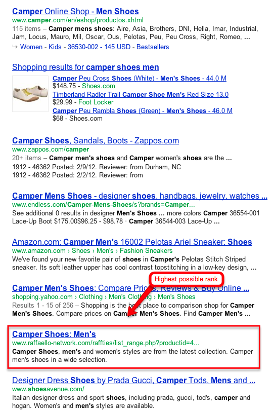 For instance, if we are a small online shoe retailer and we would like to rank for “camper shoes men,” we’re not going to outrank Camper, Zappos, Endless, Amazon or Yahoo, but we could outrank http://www.raffaello-network.com/, therefore, if we were to go after this keyword, the highest rank we could achieve would be #6.