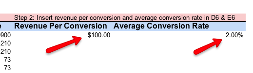 5. Insert the average revenue per conversion and average site conversion rate in cells D5 and E5, respectively.