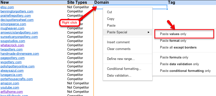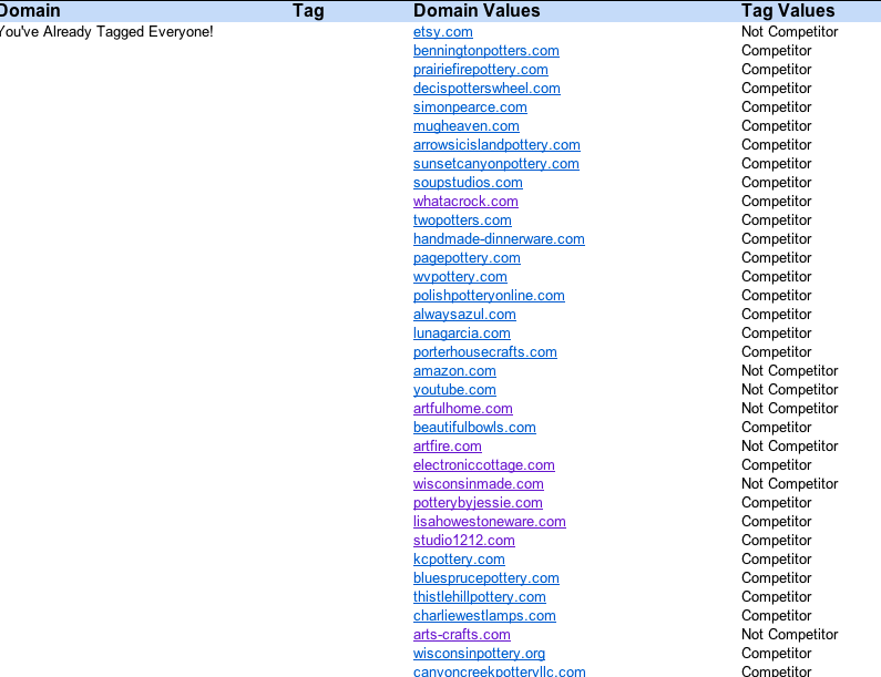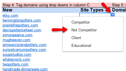 7. Use the drop downs in column C to tag the domains. You can copy and paste cells in column C so you don’t have to click 101 times. Also, you can use the Chrome Extension, Link Clump to review the domains more quickly.