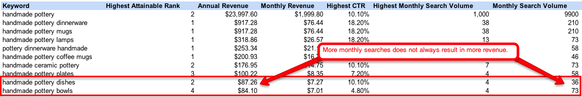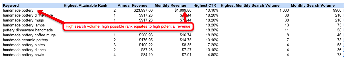 The beauty of this tool, is everything is based on your highest ranked competitor, so you won’t inflate your traffic / revenue projections. As you can see below, the ability to be ranked higher could have a more positive effect on revenue than search volume: