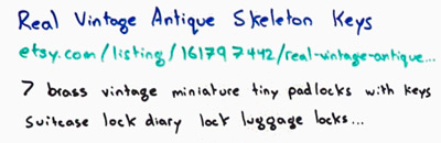The first one is the search result snippet itself. I've taken Etsy's snippet here, which is not fantastic. Then when you get to the page, that product is actually gone, and Etsy is suggesting some other ones, which aren't skeleton keys. Kind of frustrating because they do have skeleton keys if you search on the site. In any case, I'm sure Stephanie and the SEO team over at Etsy will take care of that ASAP.
