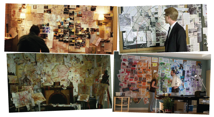 It's no coincidence that you see examples of ideas walls on TV dramas and movies such as: Homelands, Sherlock Holmes, A Beautiful Mind and Three and a Half Days Later. Detectives have long used this technique to assist solving crimes. Placing photographs of the known or suspected perpetrators, victims, crime scenes and evidence on a wall enables items of evidence to be repositioned and grouped; string can link items together for visual affect. A detective can then stand back and mentally take in a great deal of information at once. The brain begins to process and use its natural ability to seek the connections between the items, find the clues and answers to the case.