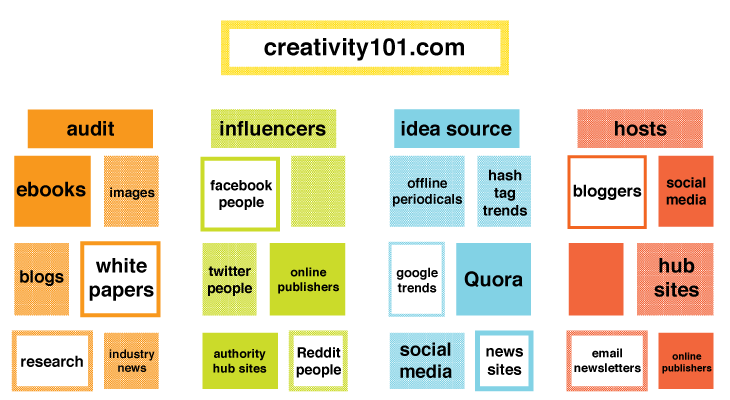 - Idea sources - places to mine ideas from such as offline periodicals, online Q&A sites like Quora, social media channels and Google trends