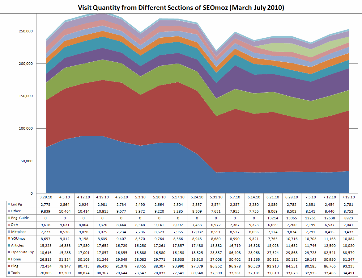 The great part about this method of benchmarking is you can easily turn it into a visual representation of the different pieces of the pie, and isolate out when things start to shift. Below is an actual example Rand pulled together earlier this week (yes he does that sort of thing for fun! A true data-head!). In this chart we have graphed out the top trafficked pages on our site, and then plotted them against each other to show how they are performing in relation to each other.