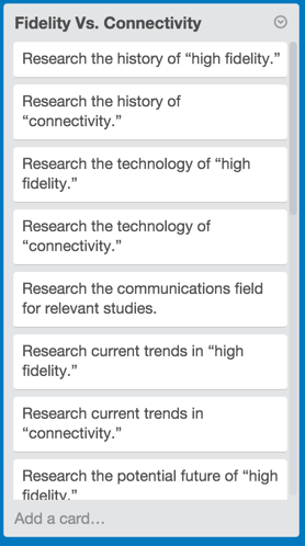 To make a basic Gantt chart using Trello, frame a Trello board. I've created one called “Interesting Article Idea,” with a list; in this case, “Fidelity Vs. Connectivity” :