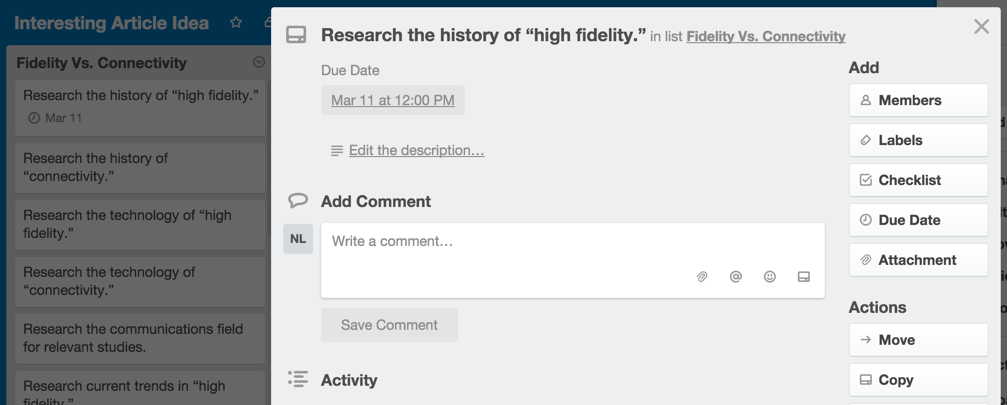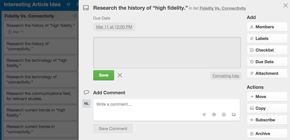 It’s a card list of how the article progresses and in what order. It’s still not ready to be a Gantt chart, but it’s close. In order to build our Gantt chart, define start dates and due dates for each card related to its associated activity, starting with what we anticipate to be the first, in this case “Research the history of ‘high fidelity’”: