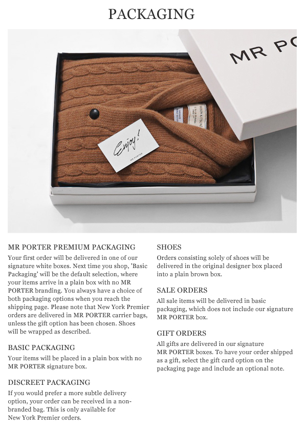 Some online fashion retailers show attractive product packaging to visitors to increase perceived value of their products. Their effort here is to compensate for the experience lag as compared to if they were in a physical showroom. Showing product packaging gives customer glimpse into product's delivery experience before they place an order. MrPorter ensures that the packaging delivers everything which customers can expect from a high fashion store. From the embossed pattern on the paper, to the crisp foiled logo and high quality boards and papers, to the hand finishing and fabric accessory ranges. They show their packaging on their website.