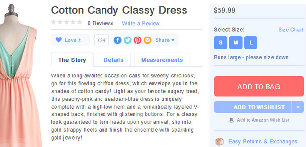With increasing maturity of Social Media as a marketing channel, new age fashion retailers no longer have to write spammy meta tags and product descriptions to please Google. You can now focus on writing crisp meta tags and product descriptions to communicate the product’s value to the customer and story behind it. ModCloth tells a story with every product they sell and so much more life to their products: