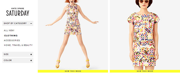 Saturday highlights their new arrivals prominently with a yellow bar saying - 'new this week'. Modcloth launches around 10 to 15 items every day to keep their store fresh for their returning visitors.
