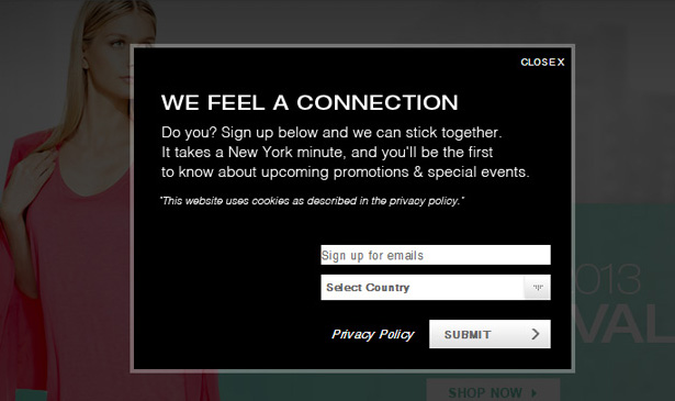 While there are many bad ways of setting this evil pop-up, there are also many ways of doing it right. Pop-up Newsletter sign-up form when you open DKNY.