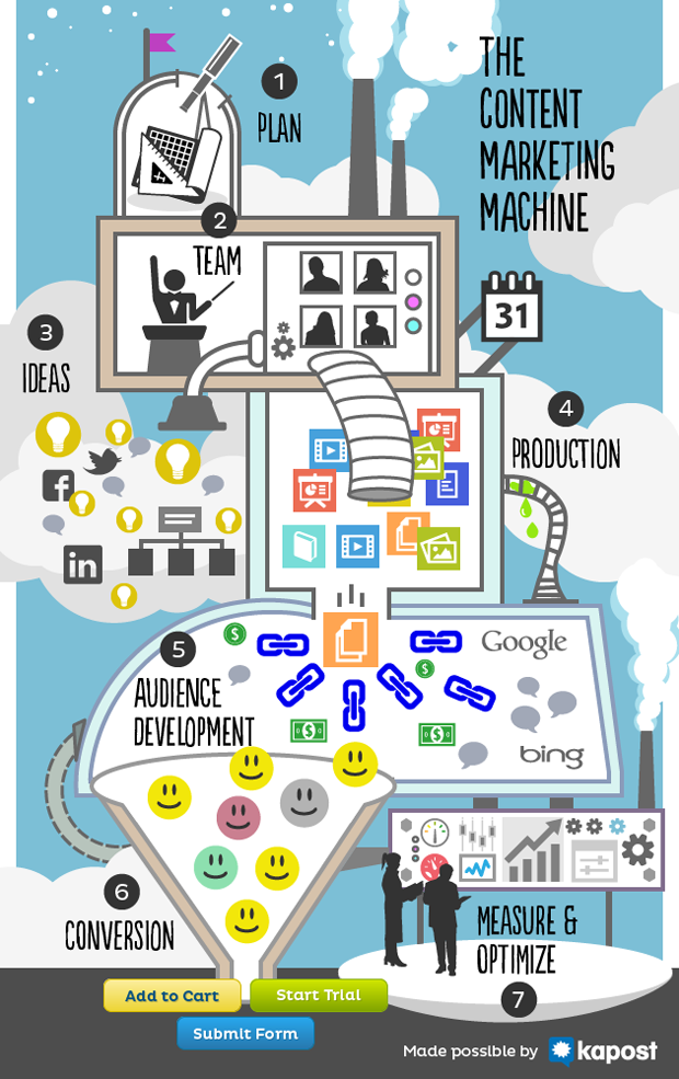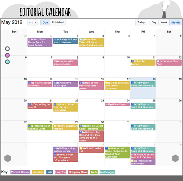 As you get your idea generation going, you’ll then need to operate the heart of the Content Marketing Machine, the content production. The centerpiece of production is an Editorial Calendar. The calendar should specify who is going to create what piece of content, when they will have it submitted, when you plan on publishing it, and to where you plan on publishing it (your site, YouTube, Slideshare, all of the above, etc.).