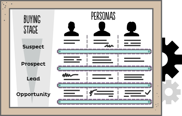 Your plan then becomes to create a content-powered path that takes your prospect from where they are today to the end goal. This plan is best plotted on a matrix, called The Content Grid, where one axis lists your customer personas and the other axis lists your various stages in the buying cycle. We can do a close-up on this part of the machine here: