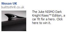 Nissan manages to get three brands and a TM into their ad. (They also completely break the Facebook ad guidelines with “click here to win it”, but if you spend as much as Nissan does, you may get to break the rules). What I also like about this image is the shark fin in that it generates a gut-level, visceral response to the image.