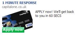 Capital One focuses on time in this ad and include the call to action in the image. The timeframe is so short that they are almost daring people to click and see if they get a response in one minute.