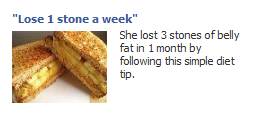 The yellow close up shot really stands out. I also love how evil this ad is – attracting the eyes of fat people with food and then selling them weight loss products. The quote and the third person text are also concepts worthy of testing in your own ads.