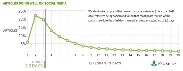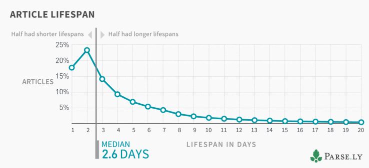 Parse.ly, an audience insight platform for digital publishers, found that 2.6 days is the median pageview peak for any single piece of content. Pageviews basically fall off a cliff shortly thereafter.