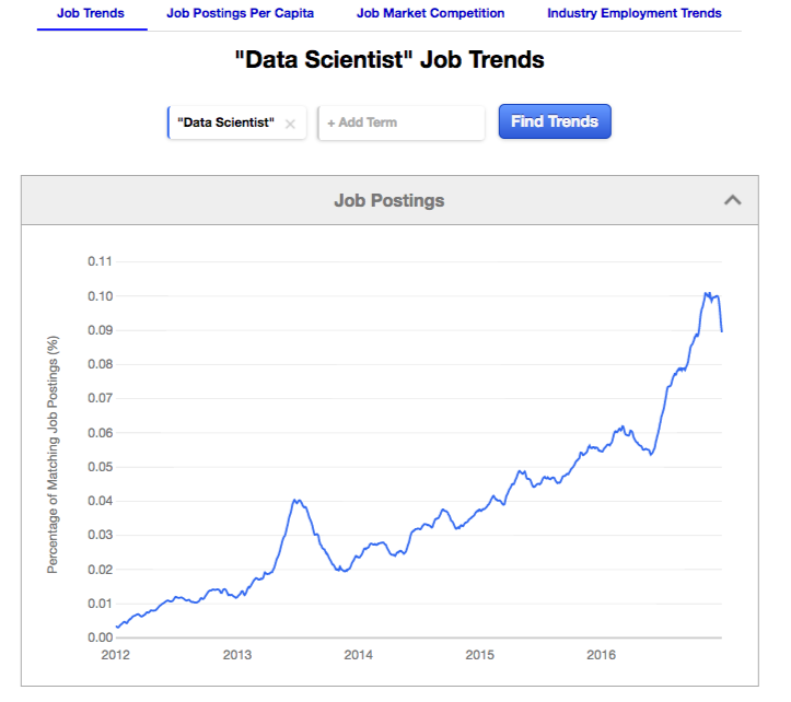 In addition to static reports, you can take this a step further and create something dynamic that is continually updated, like Indeed’s Job Trends Search (171 RDs) which pulls from their internal job listing data.