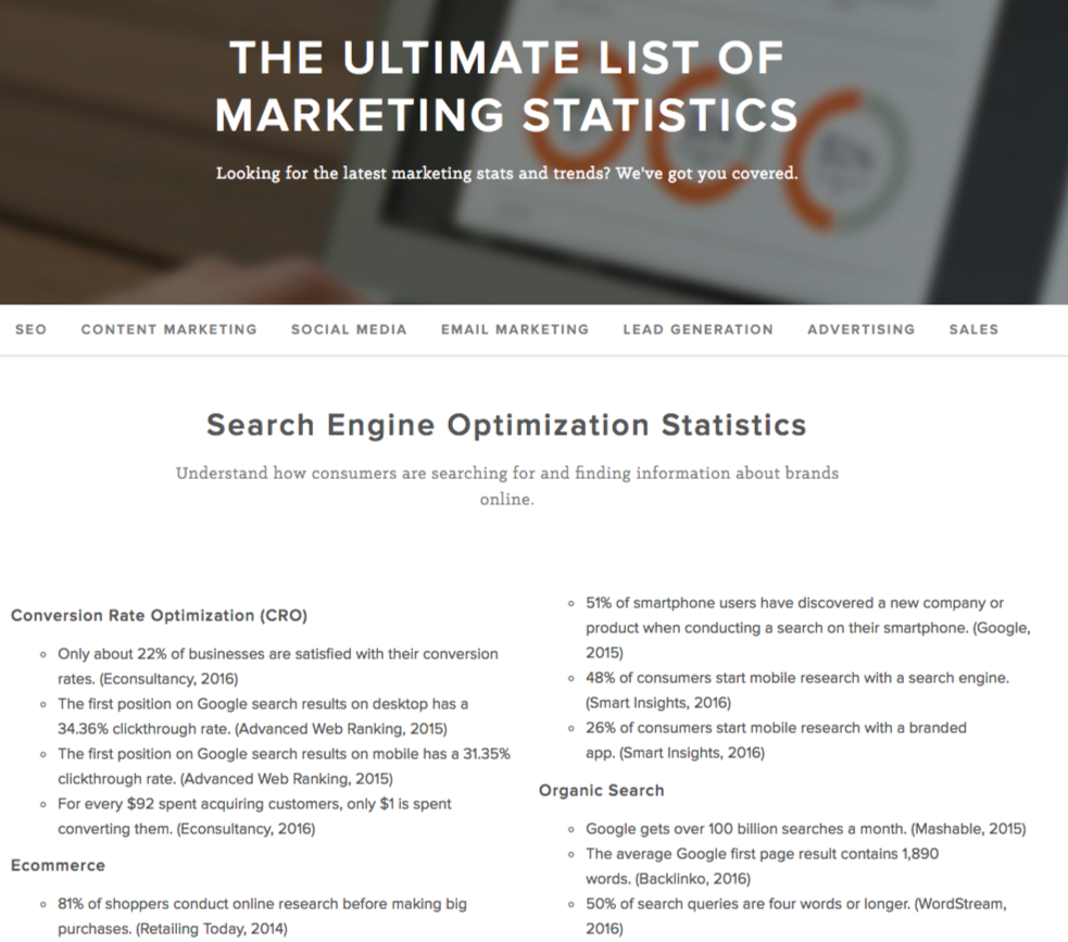 HubSpot’s marketing statistics list has attracted links from 963 root domains. For someone looking for data points to cite, a list like this can be a gold mine. This comprehensive data collection features their original data plus data from external sources. It’s regularly updated with new data, and there’s even a call-to-action at the end of the list to submit new stats.