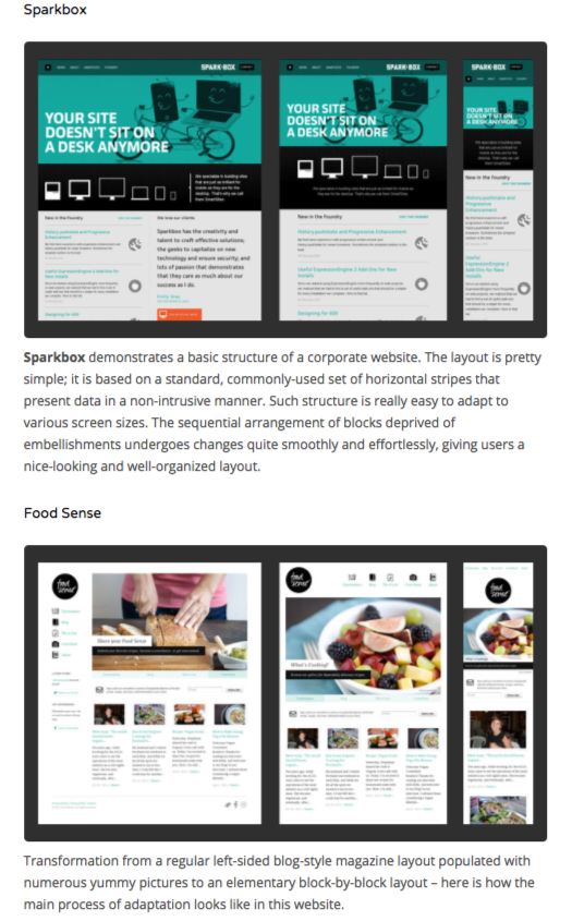 The resource below showcases 50 examples of responsive design. Simple in its execution, the content features screenshots of each responsive website and a descriptive paragraph or two. It’s earned links from 184 RDs.