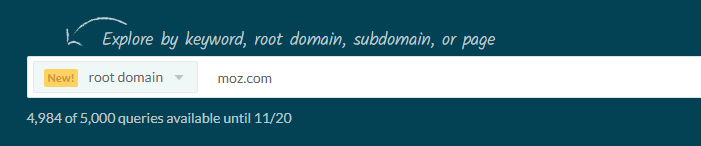 Let's say I want to find some buried content treasure right here on the Moz Blog. In the Keyword Explorer menu, I'll select "root domain" and enter our root domain, "moz.com":