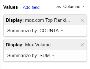 The COUNTA() function just tells Google Sheets to return the total count for each URL (for some reason, COUNT() only works on numeric values). As a bonus, I've also selected the SUM() of Max Volume. This will total up the volume for all of the ranking keywords in our data set for each URL.
