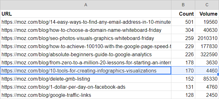 Let's get to the good stuff. When I group the URLs, I'm left with 1,604 unique blog posts in this particular data set. I can easily sort by posts ranking for the most keywords or posts with the most potential search volume (under "Data" / "Sort range"). I'm going to stick to raw keyword count. Here's just a sample: