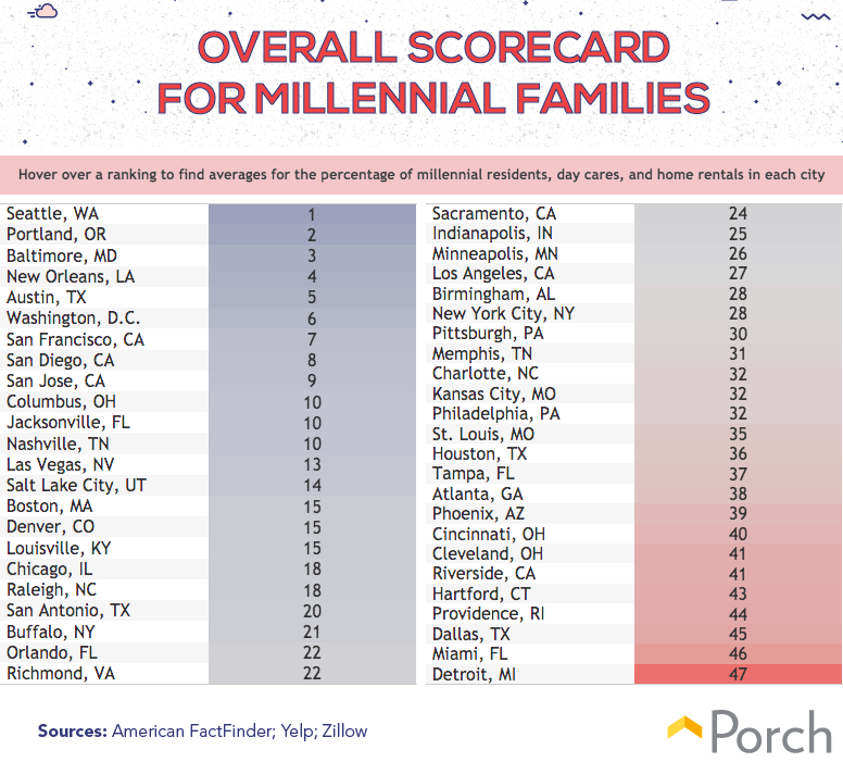 For example, for our client Porch, we used data from the U.S. Census Bureau’s American FactFinder, Yelp, and Zillow to determine which cities are the best for young families.
