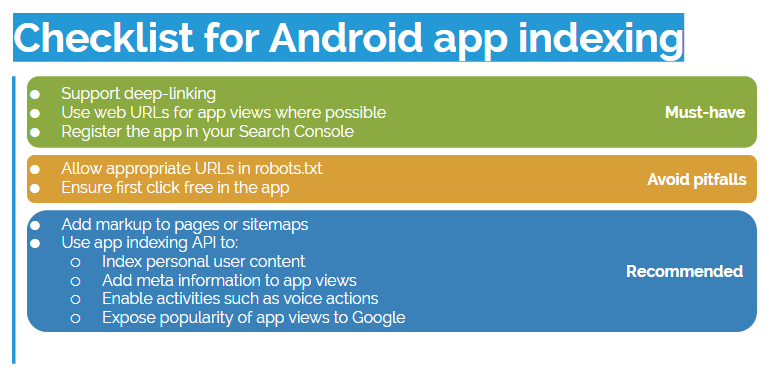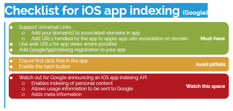 Will Critchlow recently spoke about app indexation in his presentation at Searchlove London. He provided two useful checklists for Android and iOS app indexing: