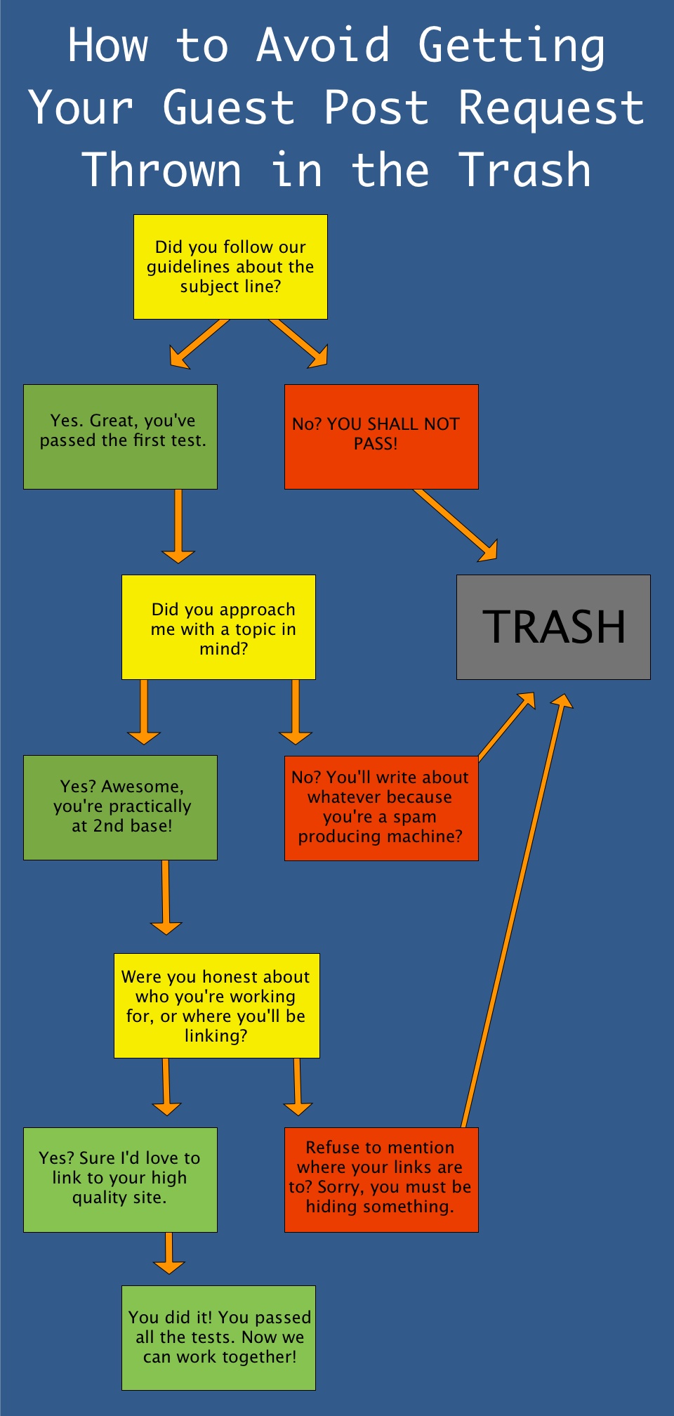 Having your guest post requests avoid the trashcan is pretty easy when you think about it. Approach it with care and time. Follow the rules and don't waste my time or yours.