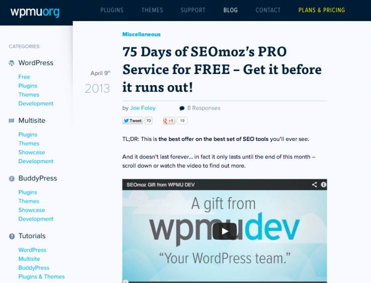 It amazes me that more software companies don't do partner distributions. The concept of a partner distribution is simple; a discounted offer on your product or service that you distribute through partners. We've done this at Moz, and it's been a huge channel — over 7,000 free trials and 2,000 paid conversions in under a year. Keep in mind, there's no cost to running partner distributions, only the increased operating costs of offering an extended free trial (in the case of Moz). To apply this to your business, you'll need a few things. The first thing is a partner page, a custom URL that you can create for each partner that explains the offer and factors in the discount. Next, you'll need some platform to return the favor. At Moz, that's Perks, which allows us to co-market, while providing some awesome value to our customers. Below is an example of a partner distribution that we did with our friends at WPMU (Perks Listing).