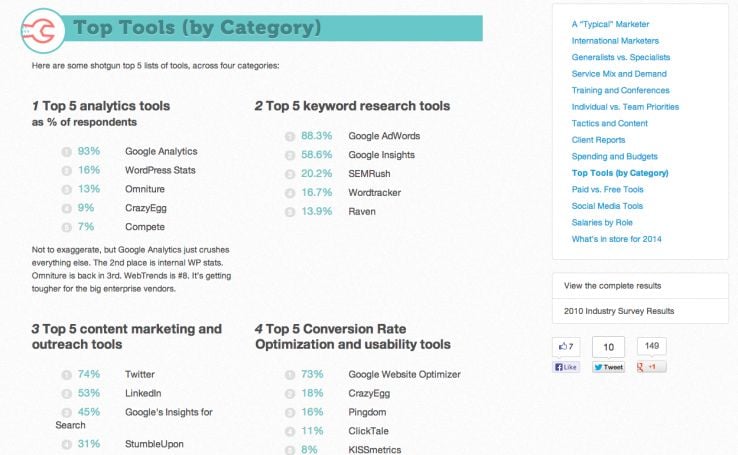 Becoming the voice of an industry can have massive implications on growth. One way to do this, as we've found at Moz, is to create an industry survey and publish the results. By doing this, you not only get to use the results for your own product intelligence, but also become the point of reference for thousands of people in your industry. This, as you can imagine, is a lot of work. Evangelizing the survey to the point it has enough data to make an impact, putting time into the analysis, and finally visualizing the data in a beautiful way can be a huge time investment. That's not to say it's not worth it, only something to consider when prioritizing. Looking back on the impact of industry surveys at Moz, it was definitely worth the time.