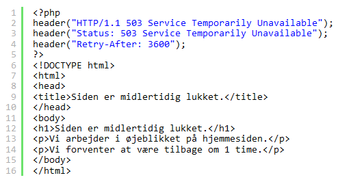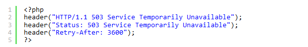 If you take down your website temporarily, you must inform search engines such as Google. As you could read above, this is done by utilizing the HTTP status code: 503 Service Unavailable, that informs the search engines that the server is temporarily unavailable. To do this one must first create a file that returns a 503 status code on the server. When the search engine sees this, it will understand the situation. This can be done by copying the four lines below into Notepad (or the like) and saving it as 503.php. You must then place this file in the root of your server.