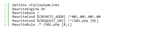 The 'R' in the last line indicates that this is a 302 redirect. R is 302 by default. To create a 301 redirect, it would have said [R=301, L]. The clever thing about this file, however, is that we can give ourselves access to the site and simultaneously show everyone else a 503 message. Let’s say you have the following IP address: 12.345.678.910. You then put the numbers in line 4 as shown below:
