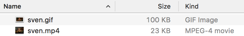 Looking at the sizes of the files, we see that the original was 100 KB. By converting the GIF to MP4, we end up with a file that is just 23 KB, which is 75% smaller: