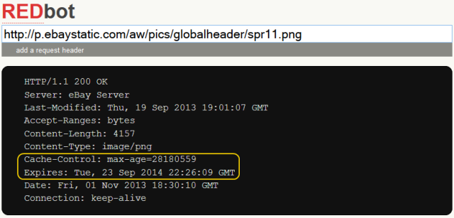 ExpiresorCache-Control: max-agein the result. For example, this image off the eBay home page will be cached by your browser for 28,180,559 seconds (just over 1 year).